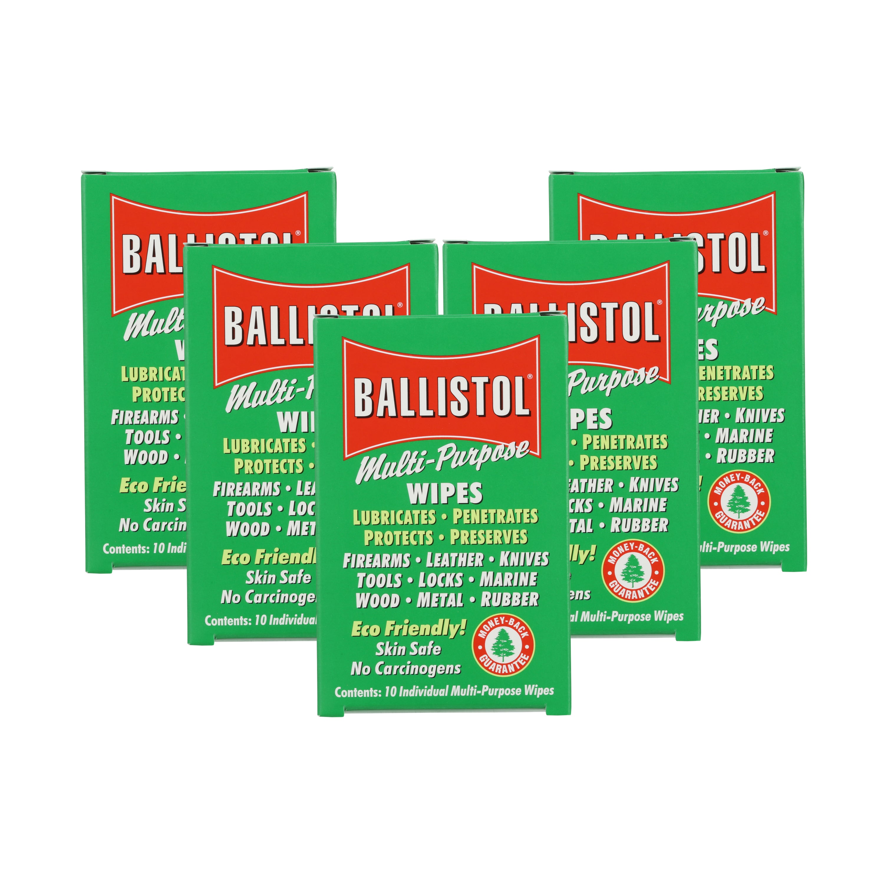 • Five Boxes of Wipes - Each box contains ten individually wrapped biodegradable Ballistol infused wipes. Perfect for cleaning tools, bringing wood back to life, wiping down gun metal parts and as a bore cleaner.