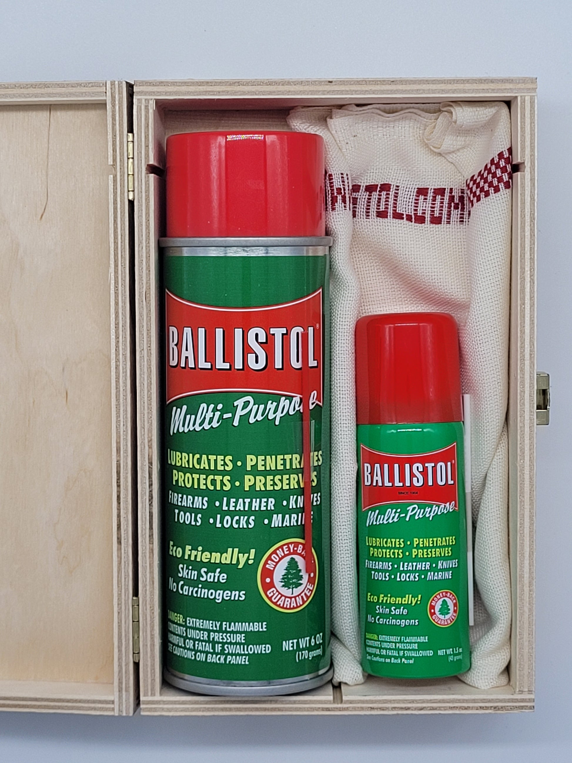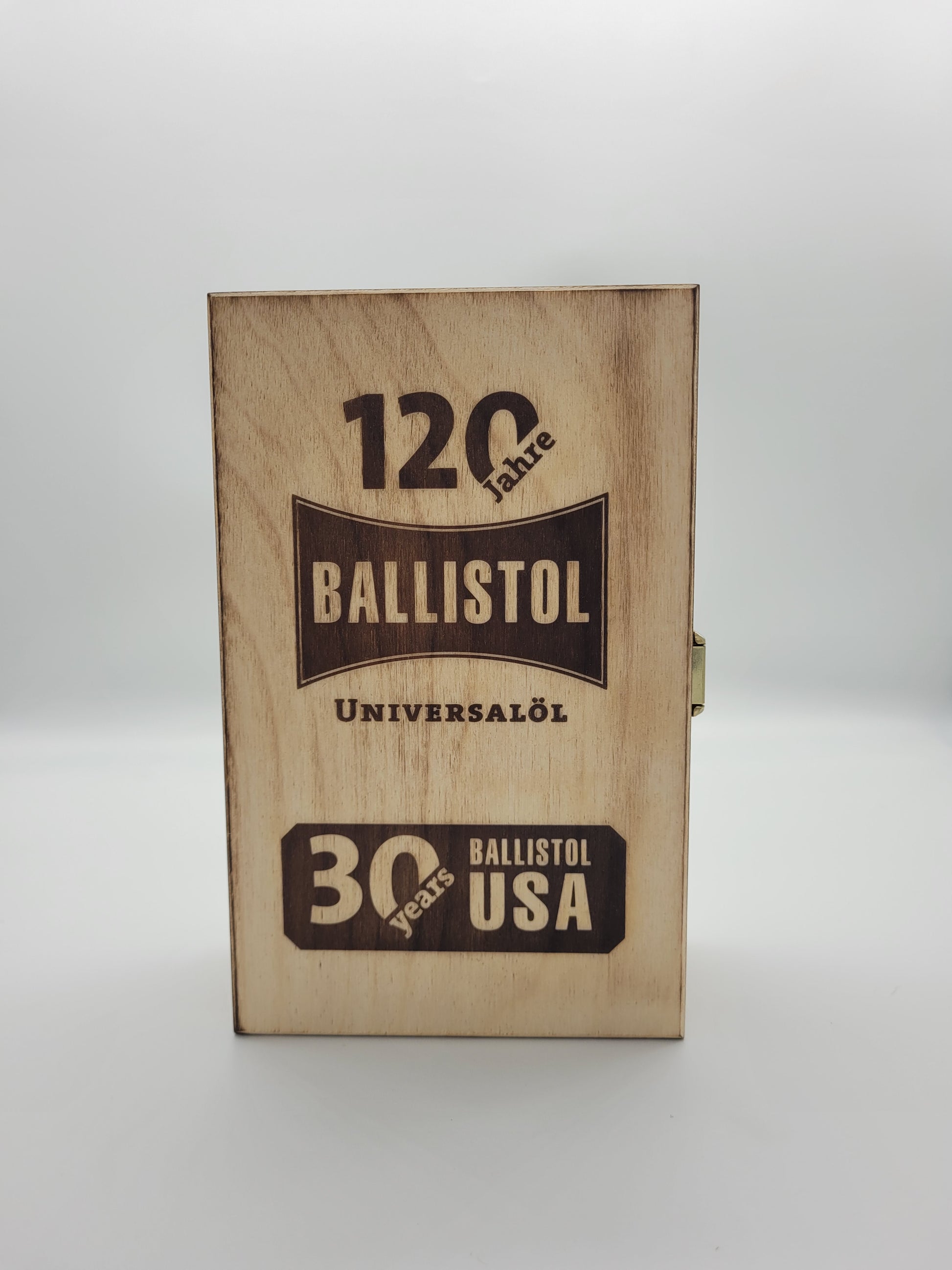 Celebrate 120 years of BALLISTOL Multi-Purpose Oil / Universaloil and 30 years for BALLISTOL USA with a custom wood burned gift box! Anniversary box includes one 6oz aerosol Multi-Purpose Oil, one 1.5oz aerosol Multi-Purpose Oil, 1 BALLISTOL care cloth, and removable inserts.